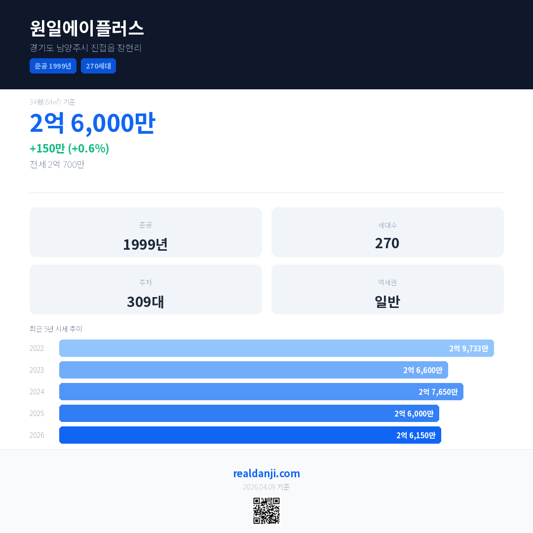 원일에이플러스 국민평형 기준 2026년 평균 거래가는 2억 6,150만으로, 전년 대비 0.6% 상승 했습니다.