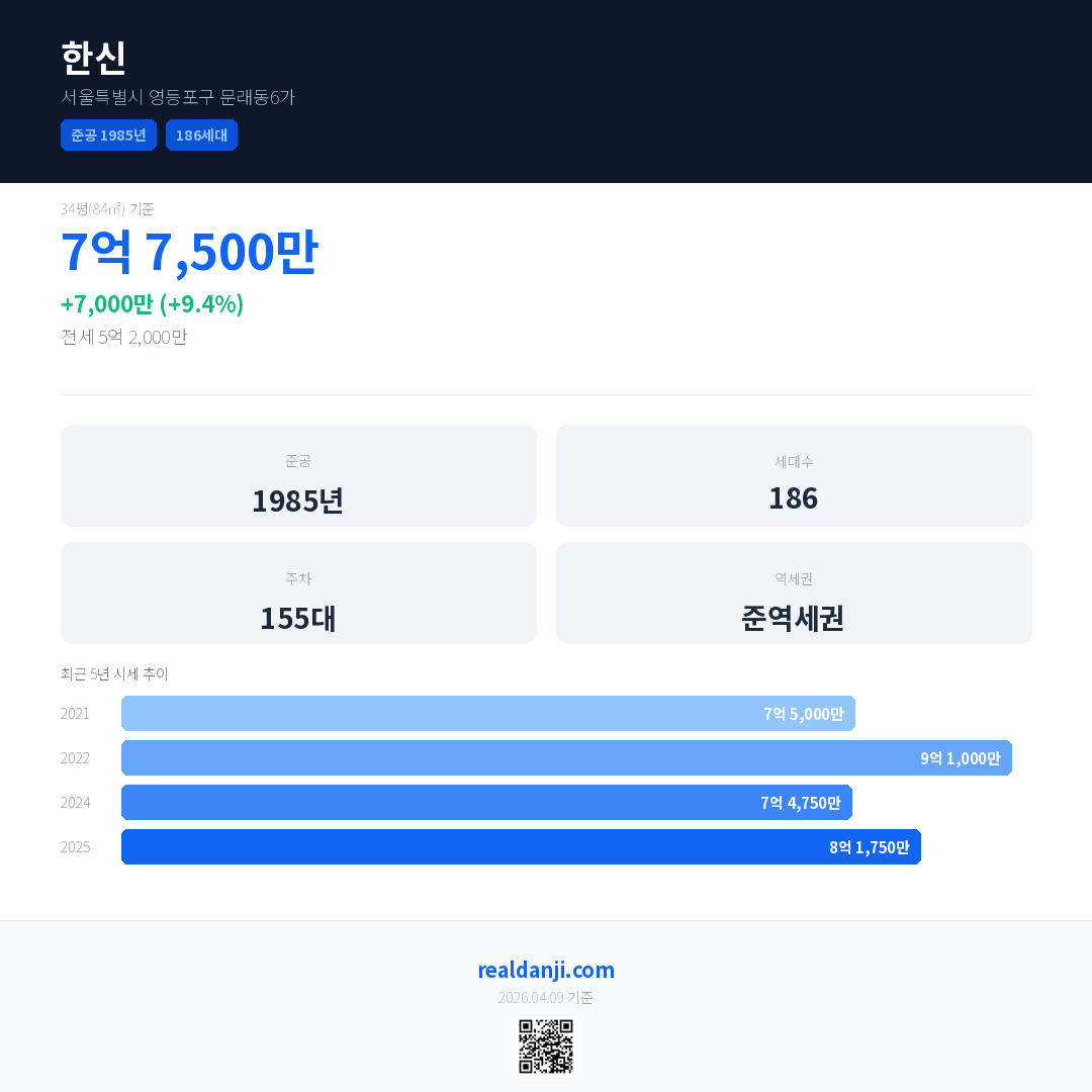 한신 국민평형 기준 2025년 평균 거래가는 8억 1,750만으로, 전년 대비 9.4% 상승 했습니다.