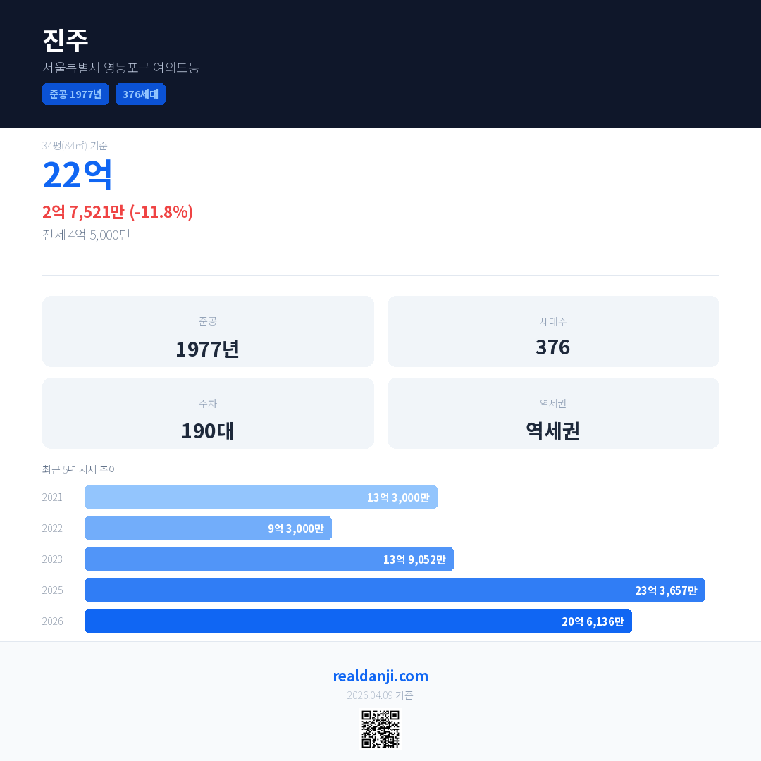 진주은(는) 1977년에 준공되었으며, 현재 49년차입니다. 총 376세대 규모입니다.