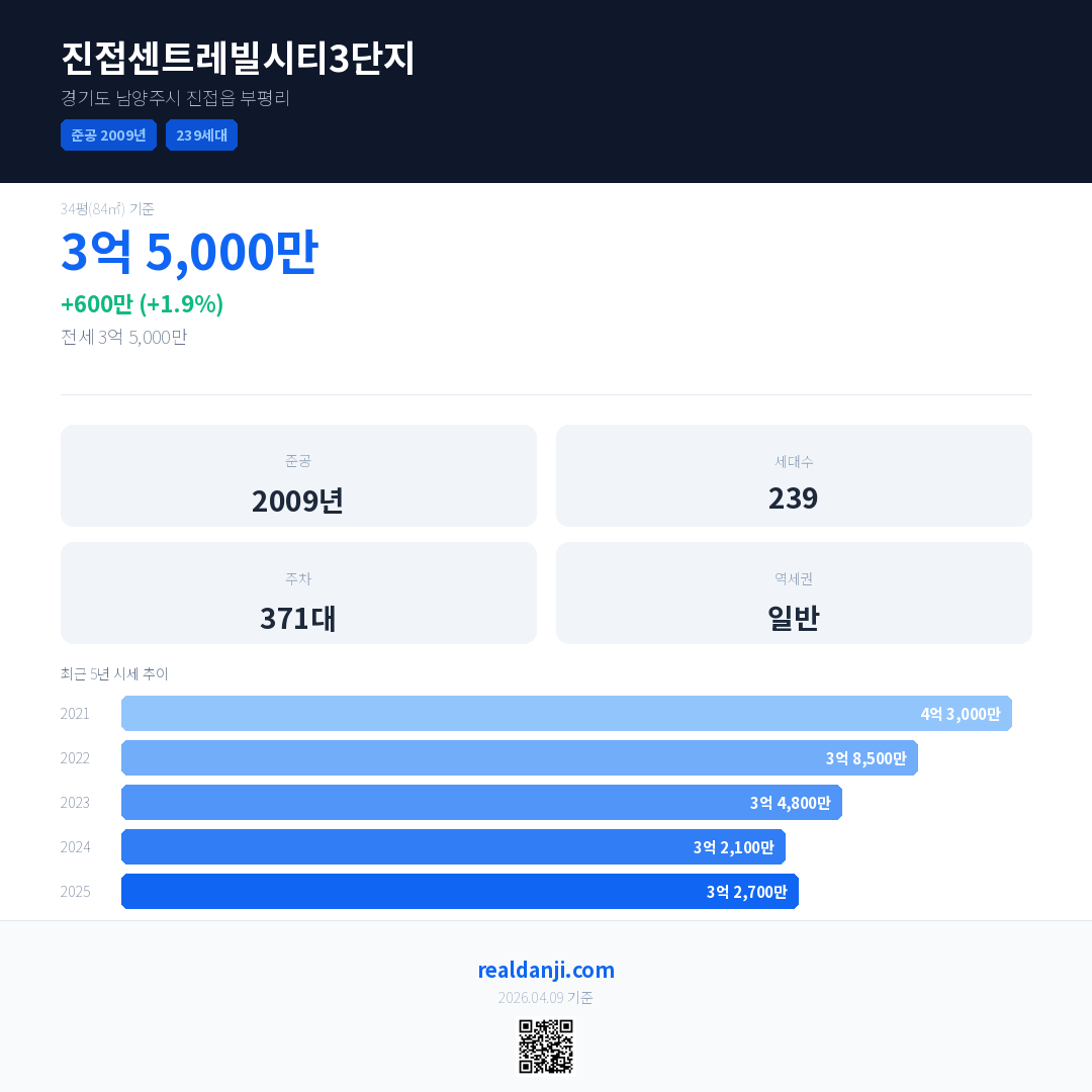 진접센트레빌시티3단지 국민평형 기준 2025년 평균 거래가는 3억 2,700만으로, 전년 대비 1.9% 상승 했습니다.