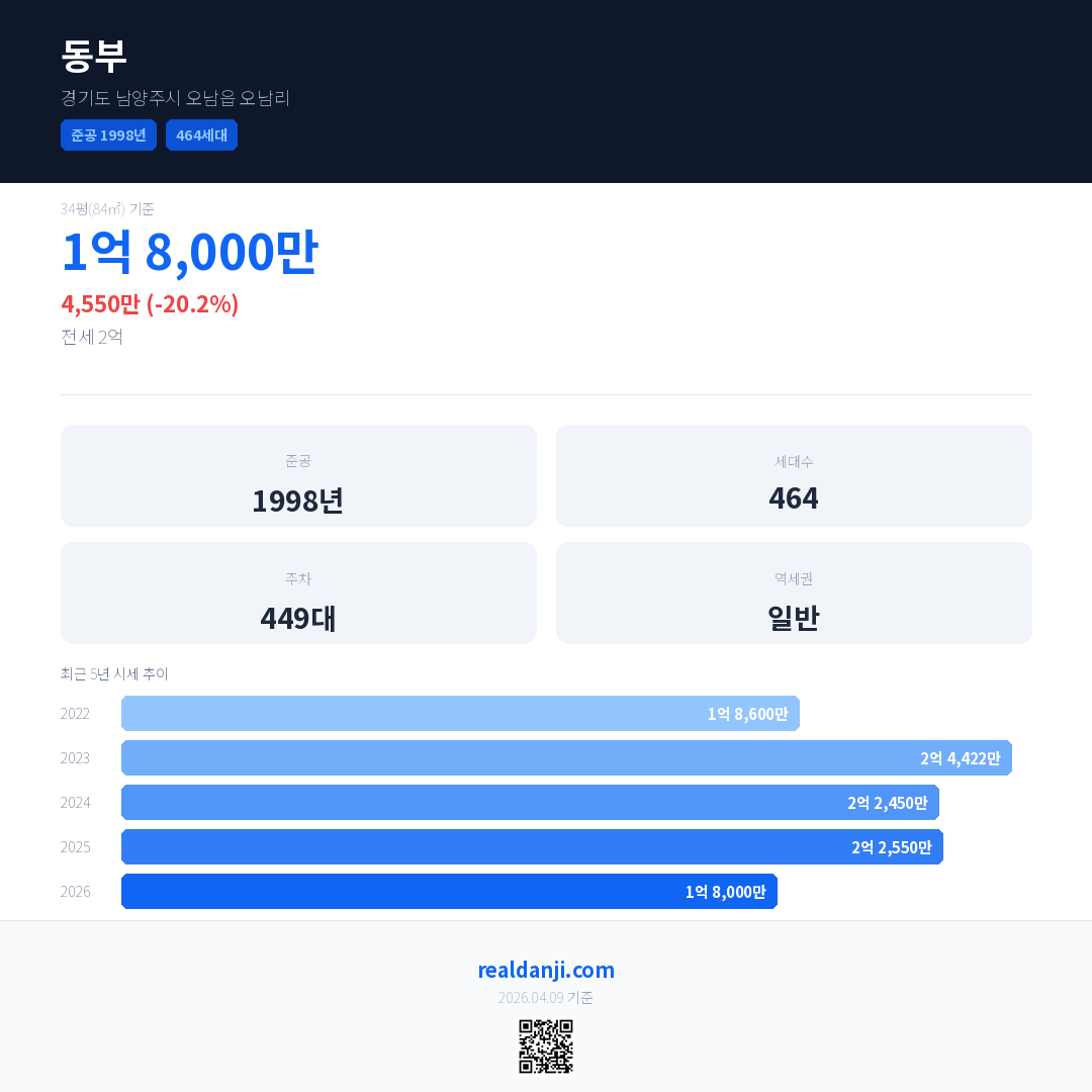 동부 국민평형 기준 2026년 평균 거래가는 1억 8,000만으로, 전년 대비 20.2% 하락 했습니다.