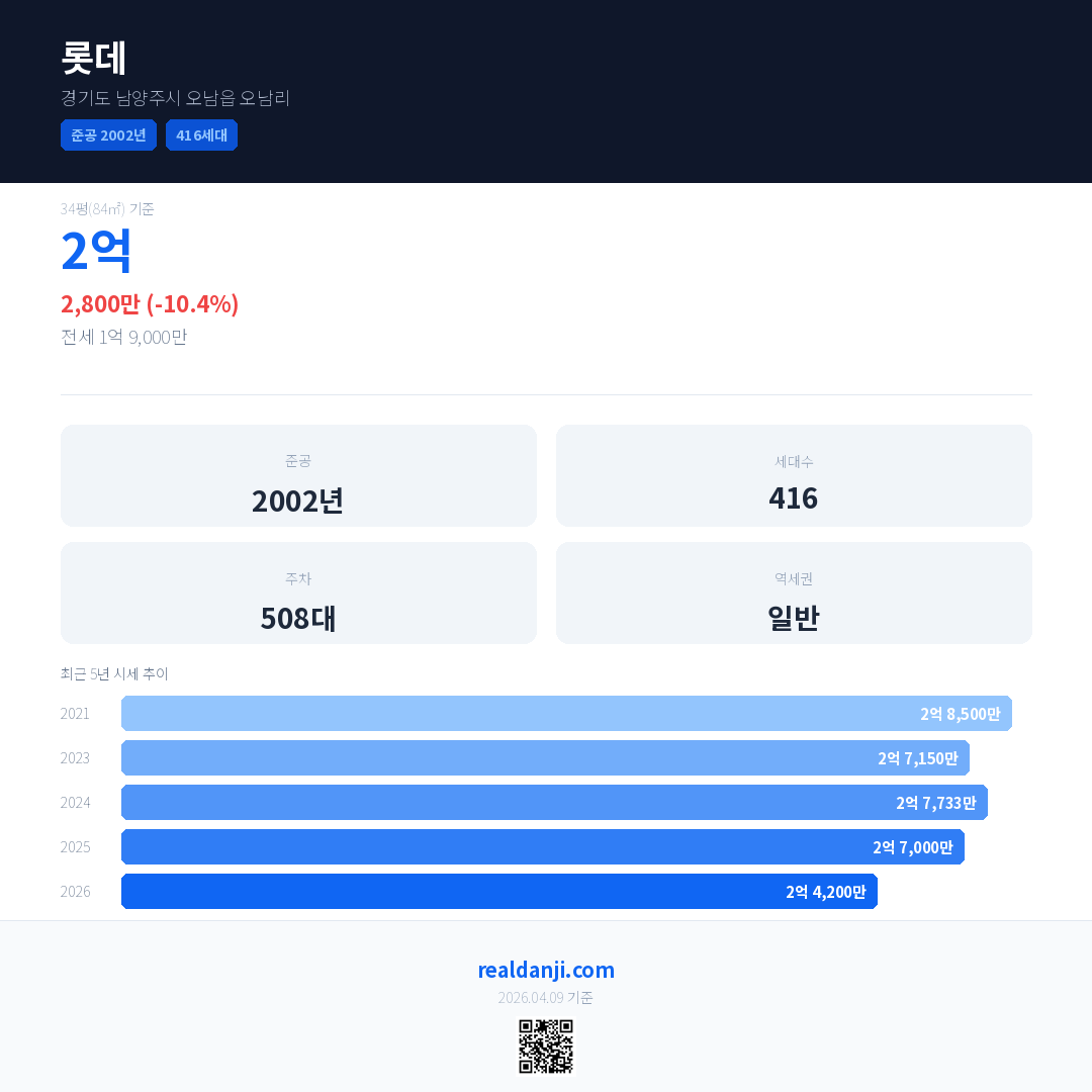 롯데 국민평형 기준 2026년 평균 거래가는 2억 4,200만으로, 전년 대비 10.4% 하락 했습니다.