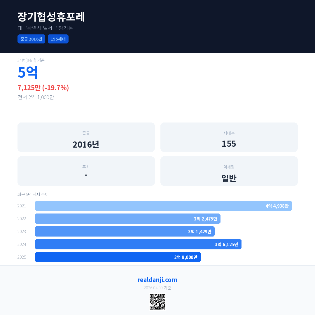 장기협성휴포레 최근 거래가는 5억입니다. (2025-08)