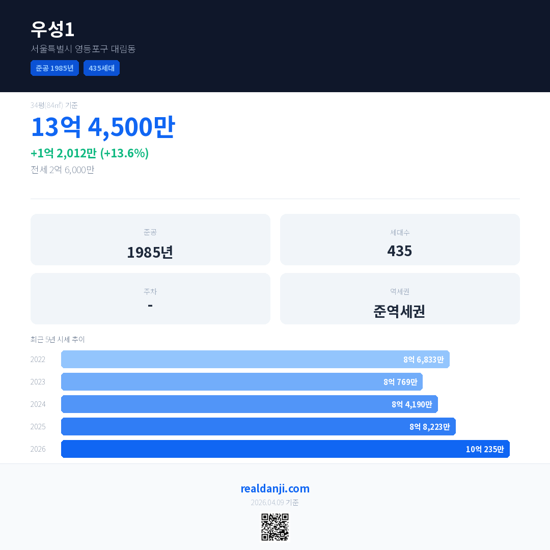 우성1 최근 거래가는 13억 4,500만입니다. (2026-03)