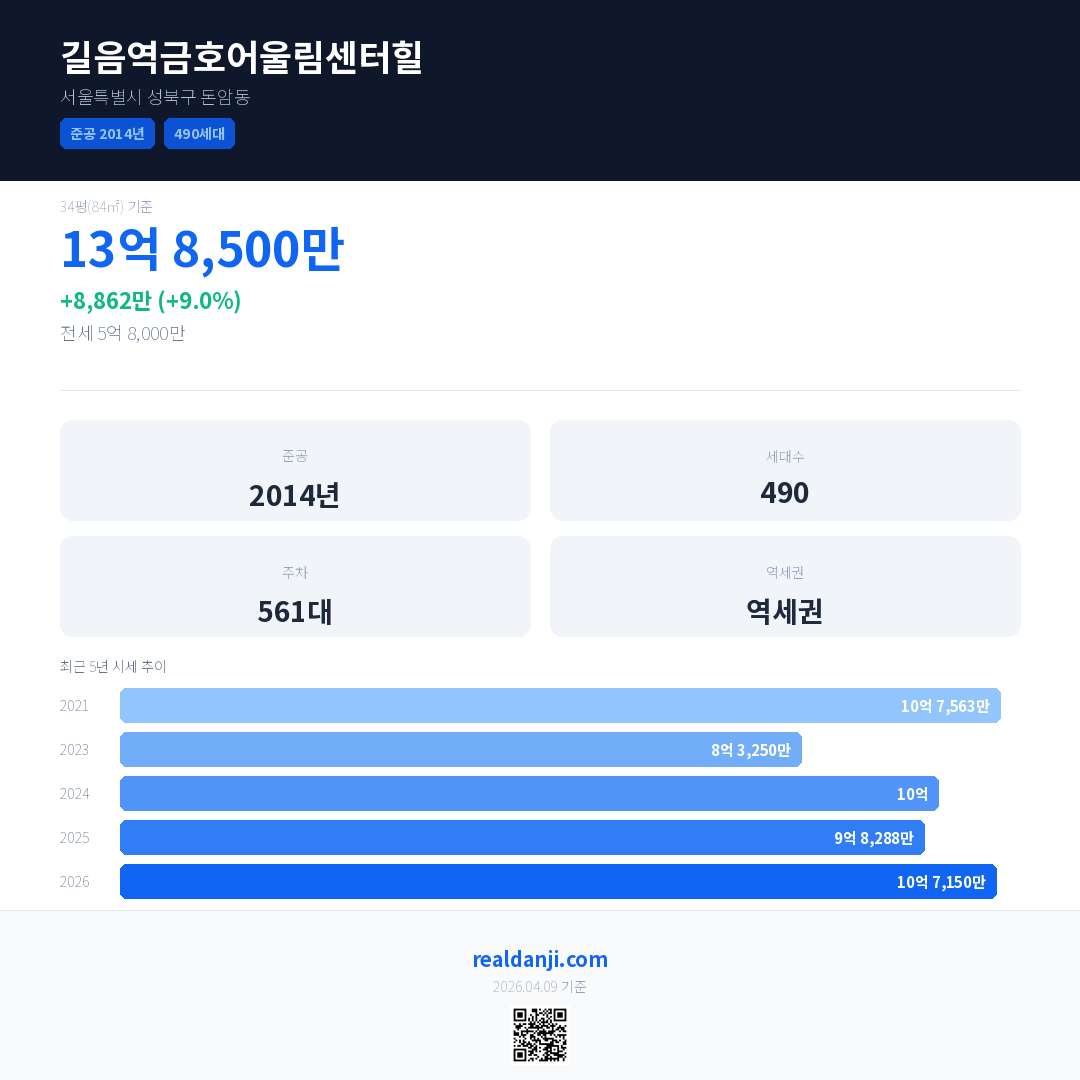 길음역금호어울림센터힐은(는) 2014년에 준공되었으며, 현재 12년차입니다. 총 490세대 규모입니다.