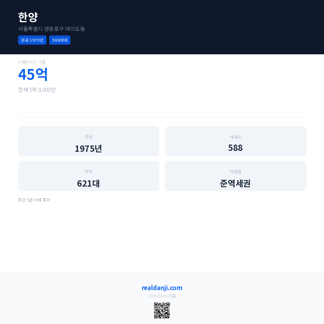 한양은(는) 1975년에 준공되었으며, 현재 51년차입니다. 총 588세대 규모입니다.