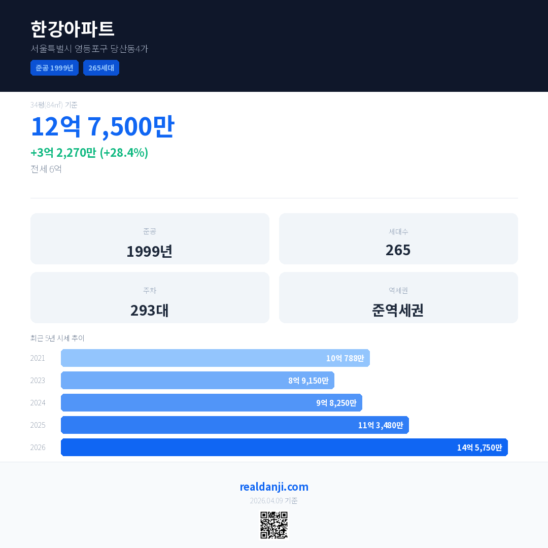 한강아파트 최근 거래가는 14억 9,000만입니다. (2026-03)