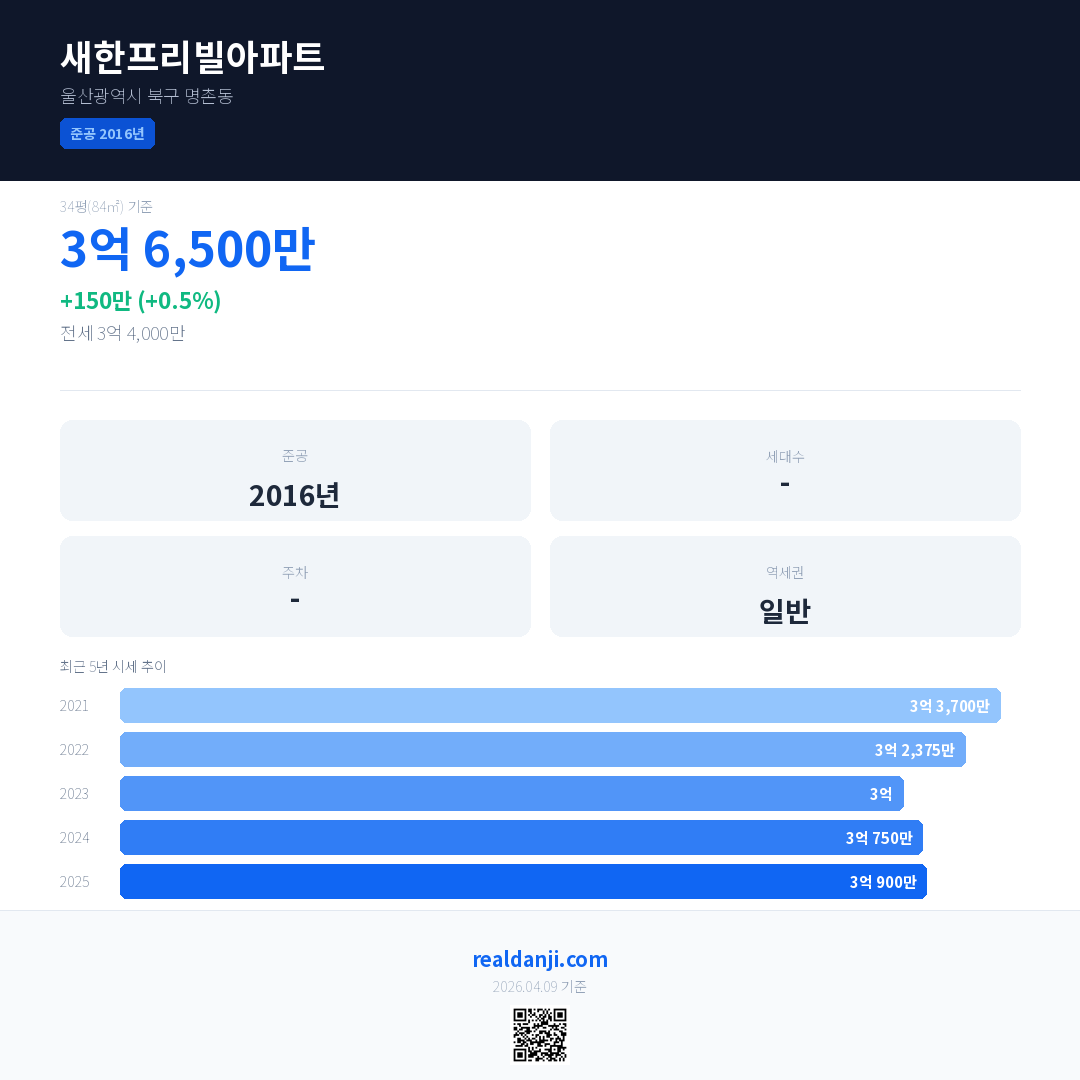 새한프리빌아파트 최근 거래가는 3억 6,500만입니다. (2025-08)