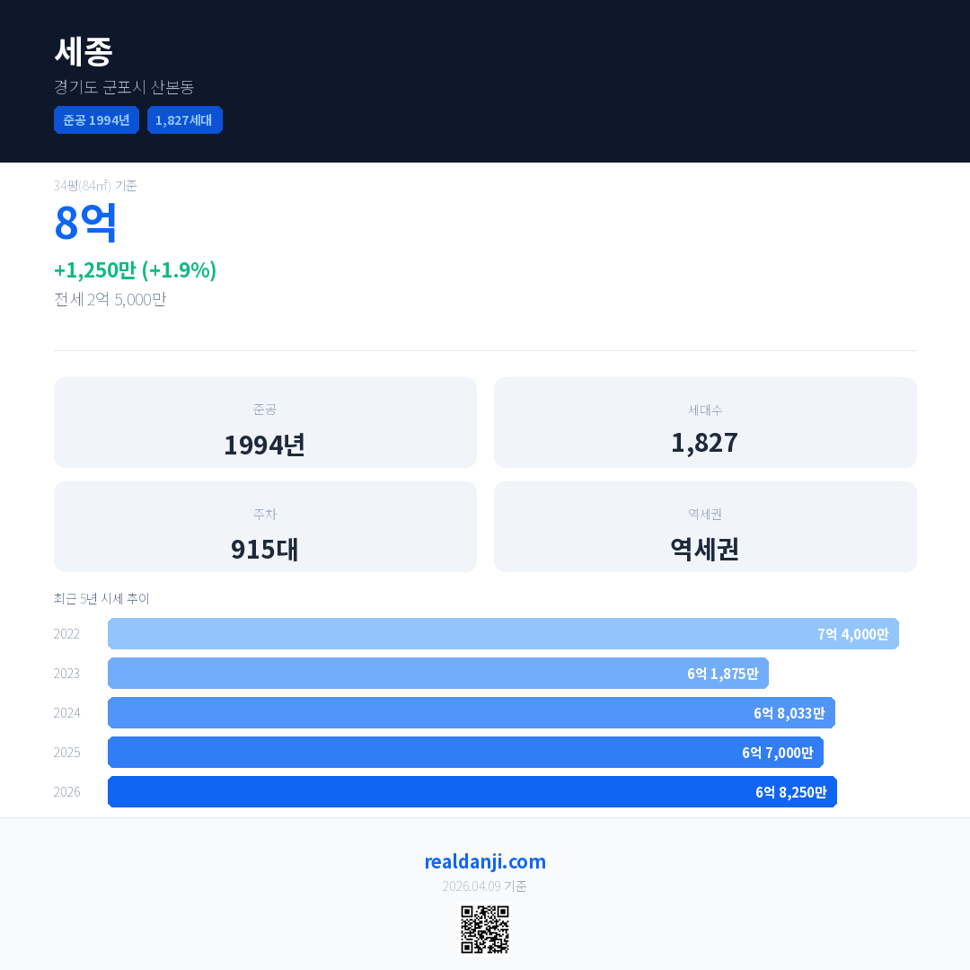 세종 국민평형 기준 2026년 평균 거래가는 6억 8,250만으로, 전년 대비 1.9% 상승 했습니다.