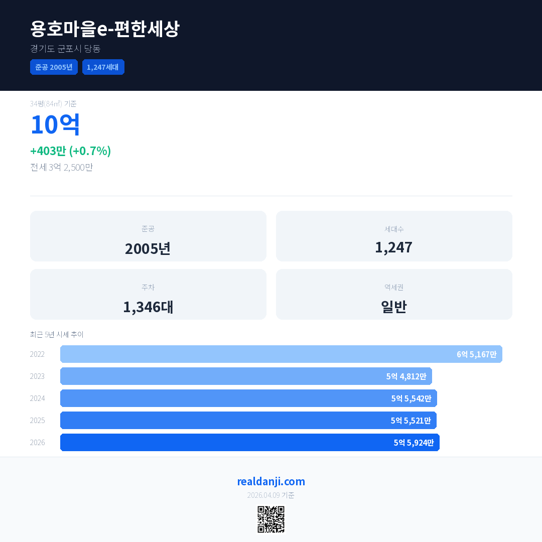 용호마을e-편한세상 국민평형 기준 2026년 평균 거래가는 5억 5,924만으로, 전년 대비 0.7% 상승 했습니다.