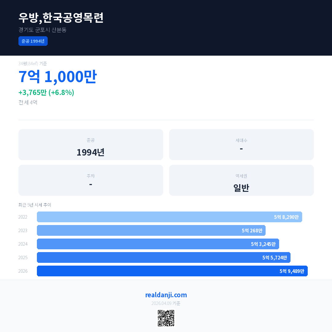 우방,한국공영목련 국민평형 기준 2026년 평균 거래가는 5억 9,489만으로, 전년 대비 6.8% 상승 했습니다.