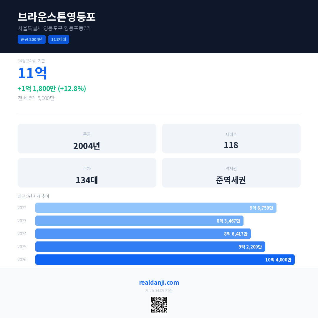 브라운스톤영등포 최근 거래가는 10억 6,000만입니다. (2026-04)