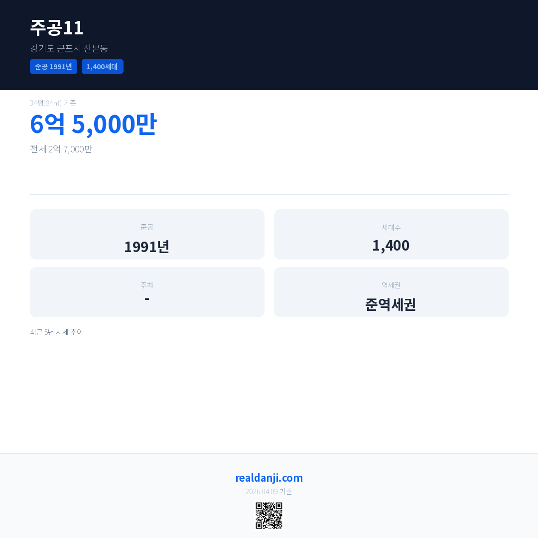 주공11은(는) 1991년에 준공되었으며, 현재 35년차입니다. 총 1,400세대 규모입니다.