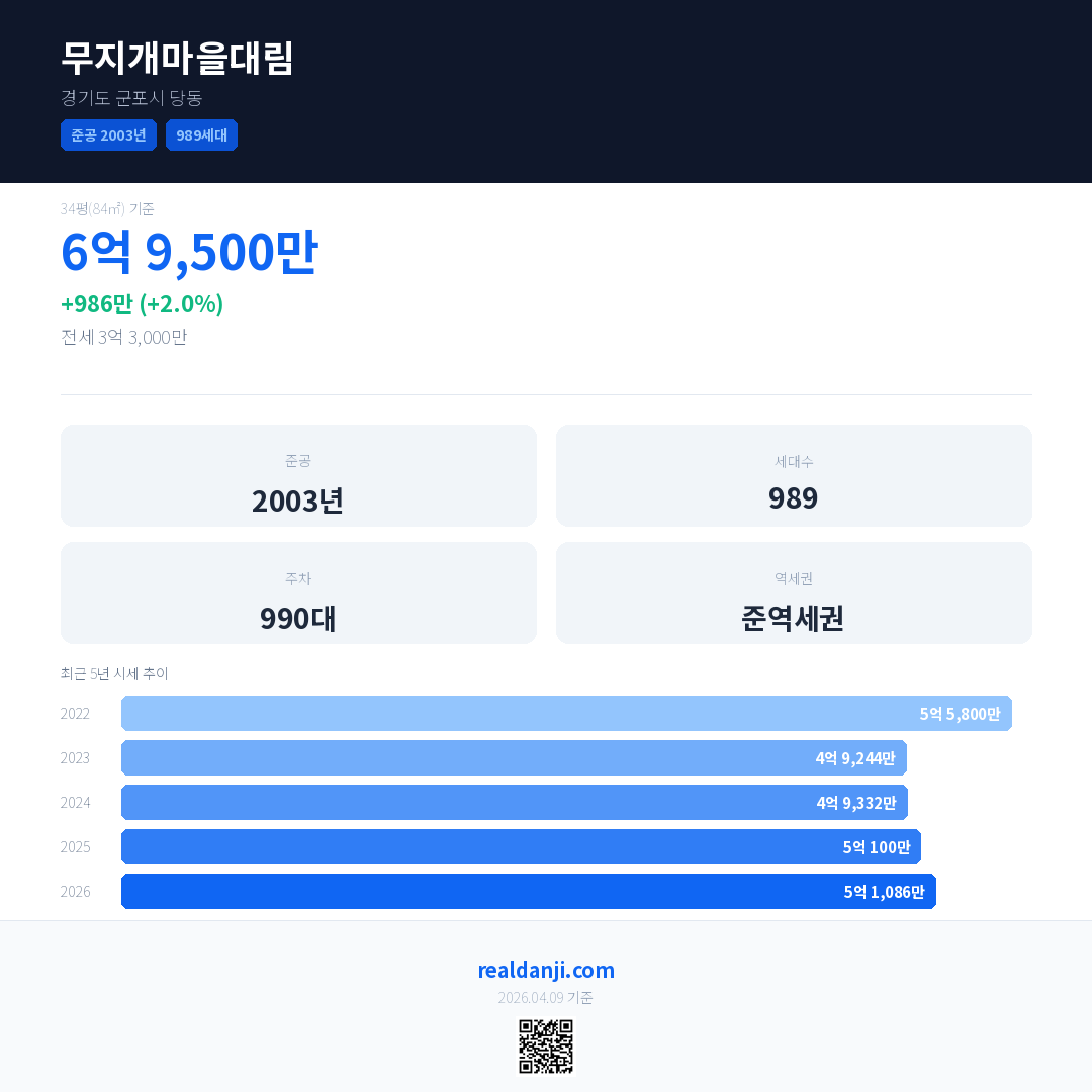 무지개마을대림 국민평형 기준 2026년 평균 거래가는 5억 1,086만으로, 전년 대비 2.0% 상승 했습니다.