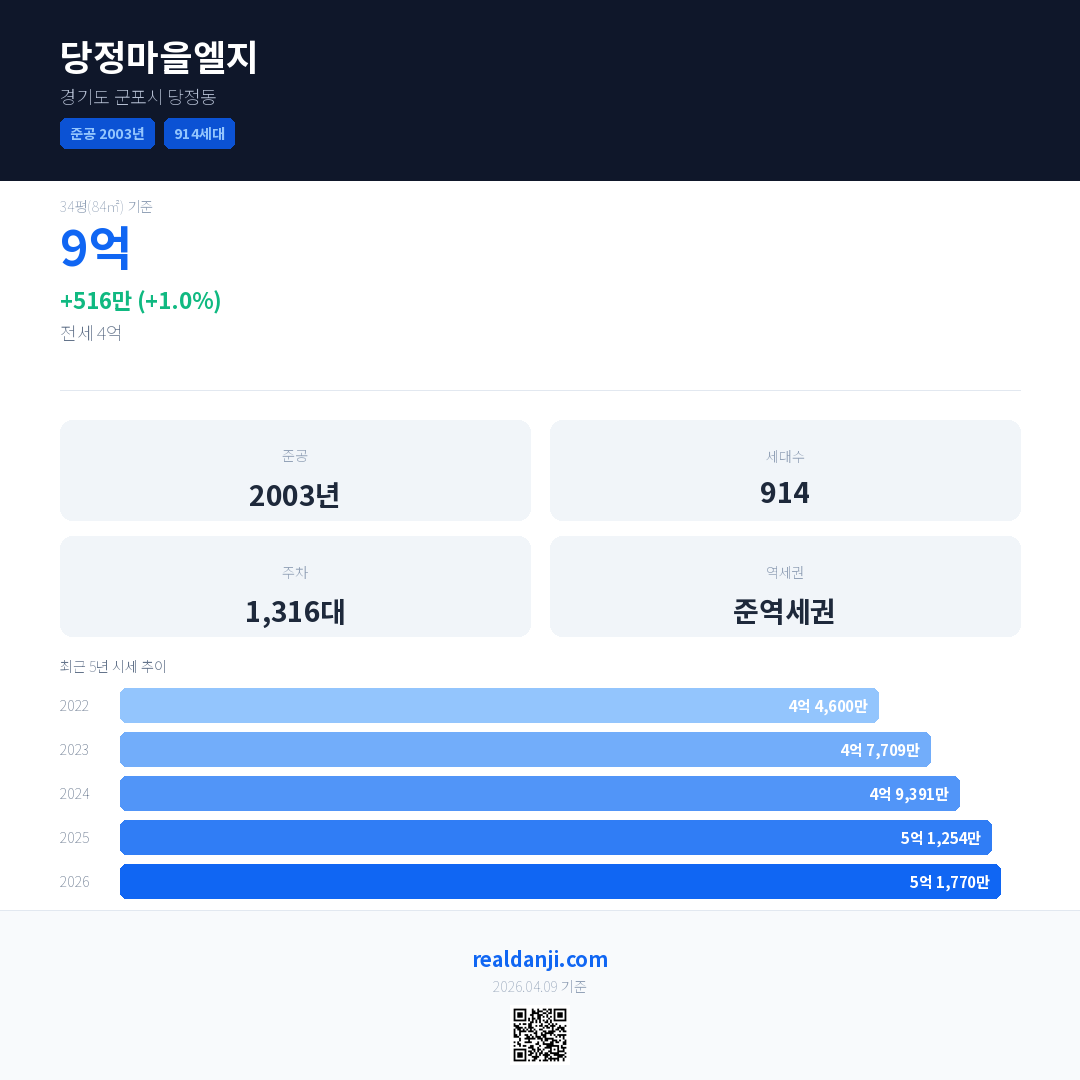 당정마을엘지 최근 거래가는 9억입니다. (2026-03)