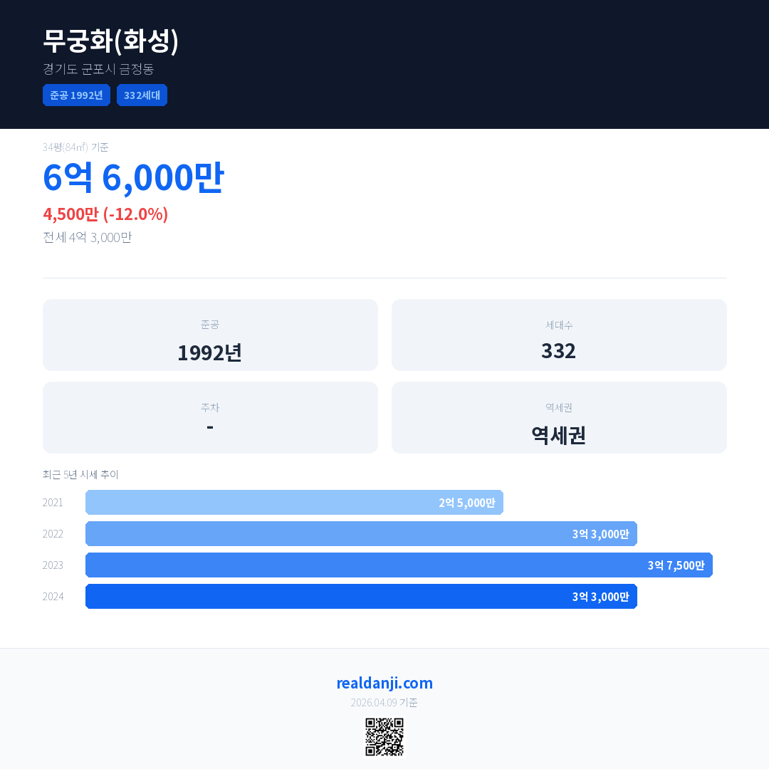 무궁화(화성) 국민평형 기준 2024년 평균 거래가는 3억 3,000만으로, 전년 대비 12.0% 하락 했습니다.