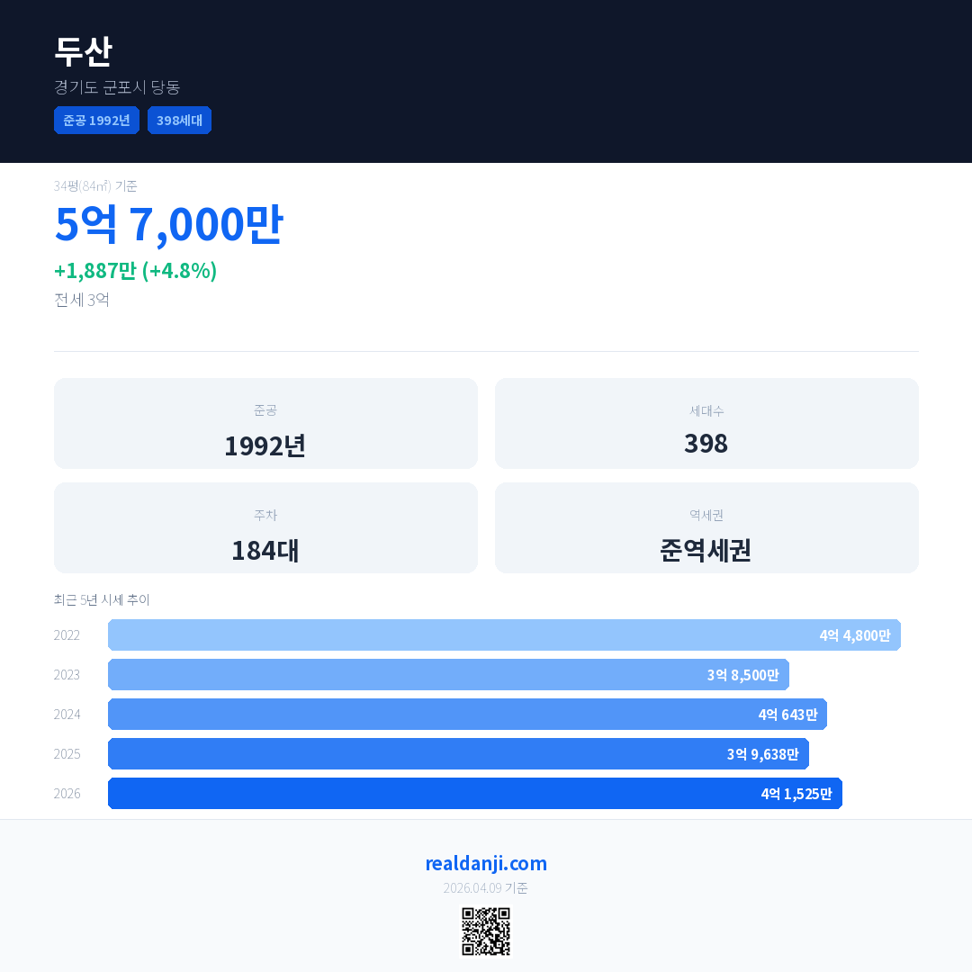 두산은(는) 1992년에 준공되었으며, 현재 34년차입니다. 총 398세대 규모입니다.