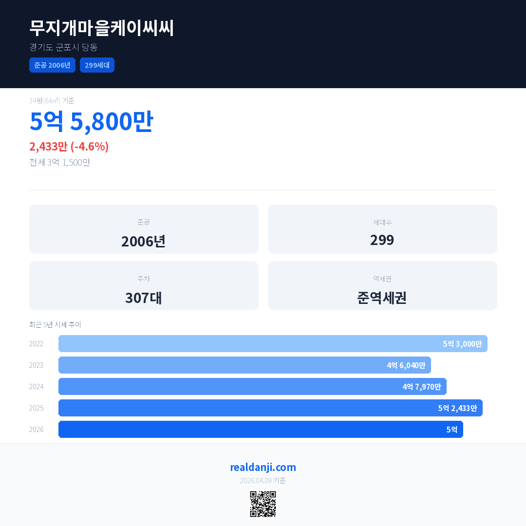 무지개마을케이씨씨 국민평형 기준 2026년 평균 거래가는 5억으로, 전년 대비 4.6% 하락 했습니다.