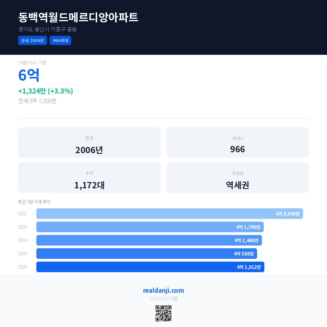 동백역월드메르디앙아파트 국민평형 기준 2026년 평균 거래가는 4억 1,912만으로, 전년 대비 3.3% 상승 했습니다.