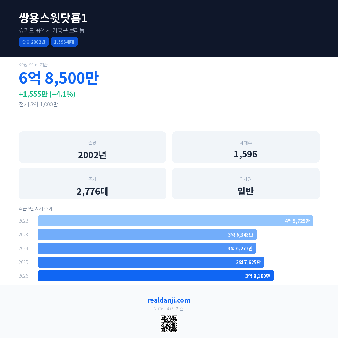 쌍용스윗닷홈1 국민평형 기준 2026년 평균 거래가는 3억 9,180만으로, 전년 대비 4.1% 상승 했습니다.