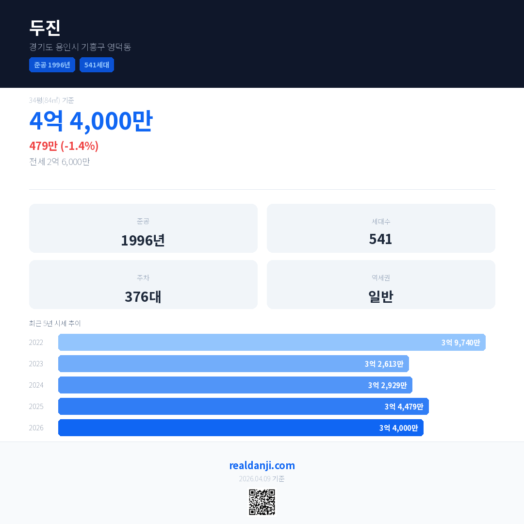 두진 국민평형 기준 2026년 평균 거래가는 3억 4,000만으로, 전년 대비 1.4% 하락 했습니다.