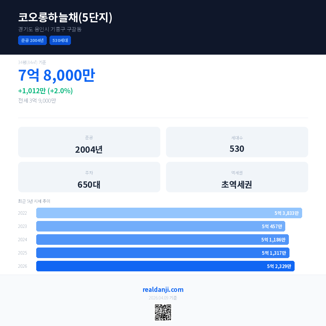코오롱하늘채(5단지) 최근 거래가는 7억 8,000만입니다. (2026-03)