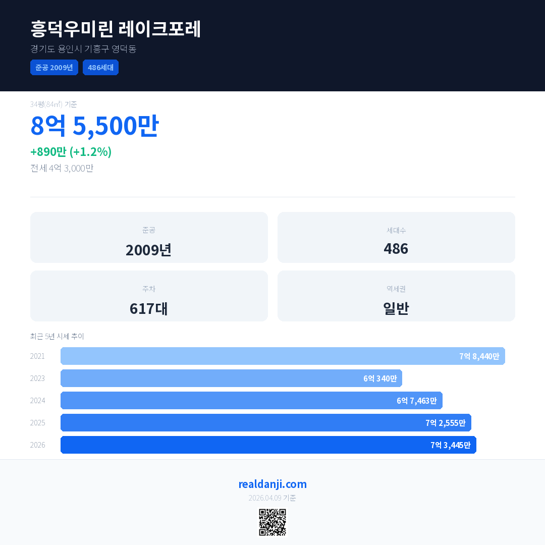 흥덕우미린 레이크포레 최근 거래가는 8억 5,500만입니다. (2026-03)