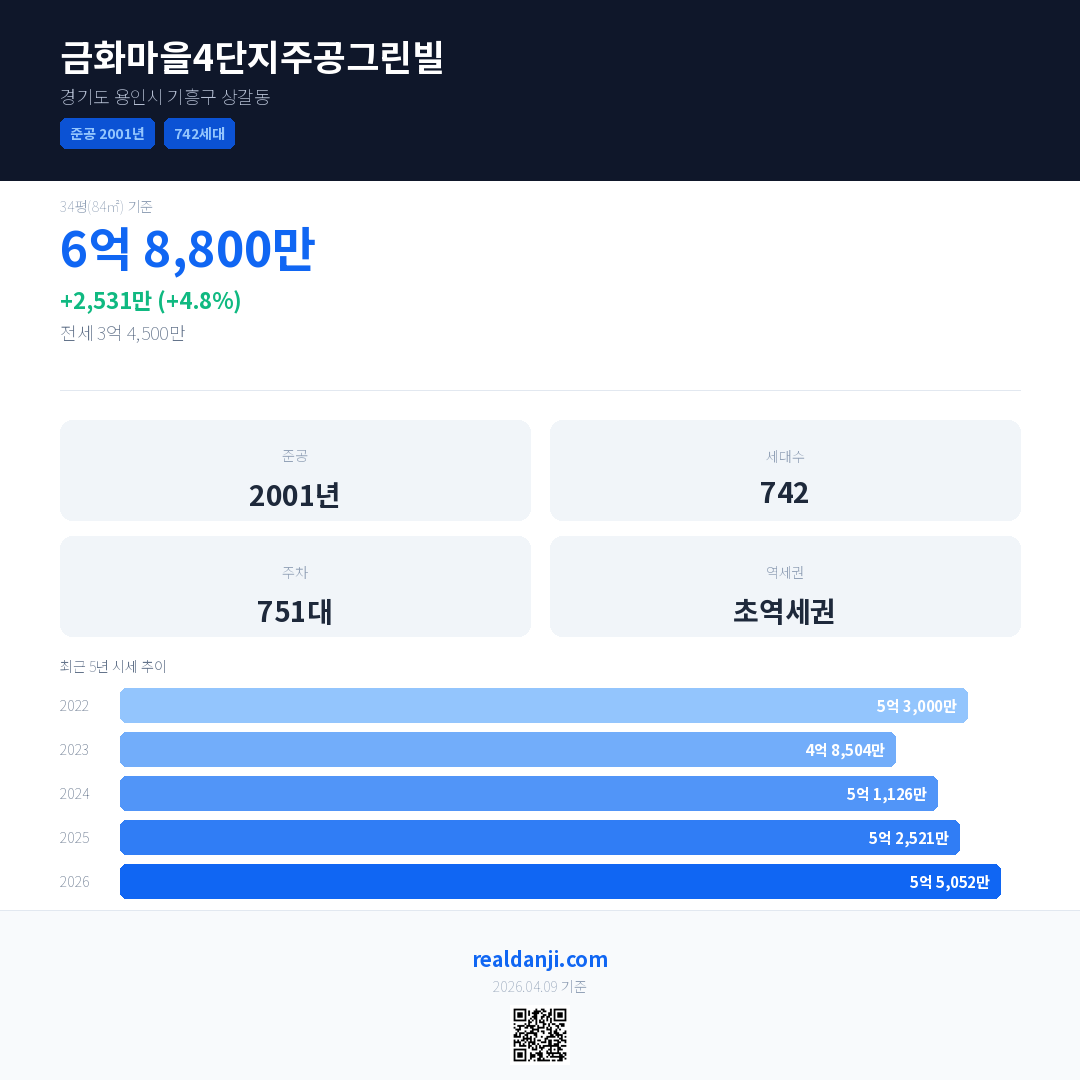 금화마을4단지주공그린빌 국민평형 기준 2026년 평균 거래가는 5억 5,052만으로, 전년 대비 4.8% 상승 했습니다.