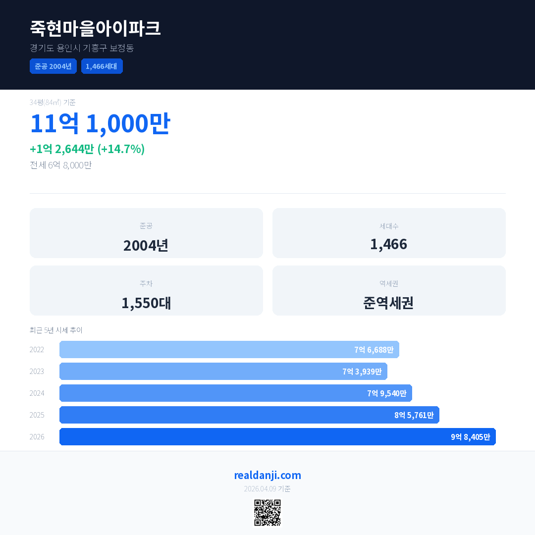 죽현마을아이파크 국민평형 기준 2026년 평균 거래가는 9억 8,405만으로, 전년 대비 14.7% 상승 했습니다.