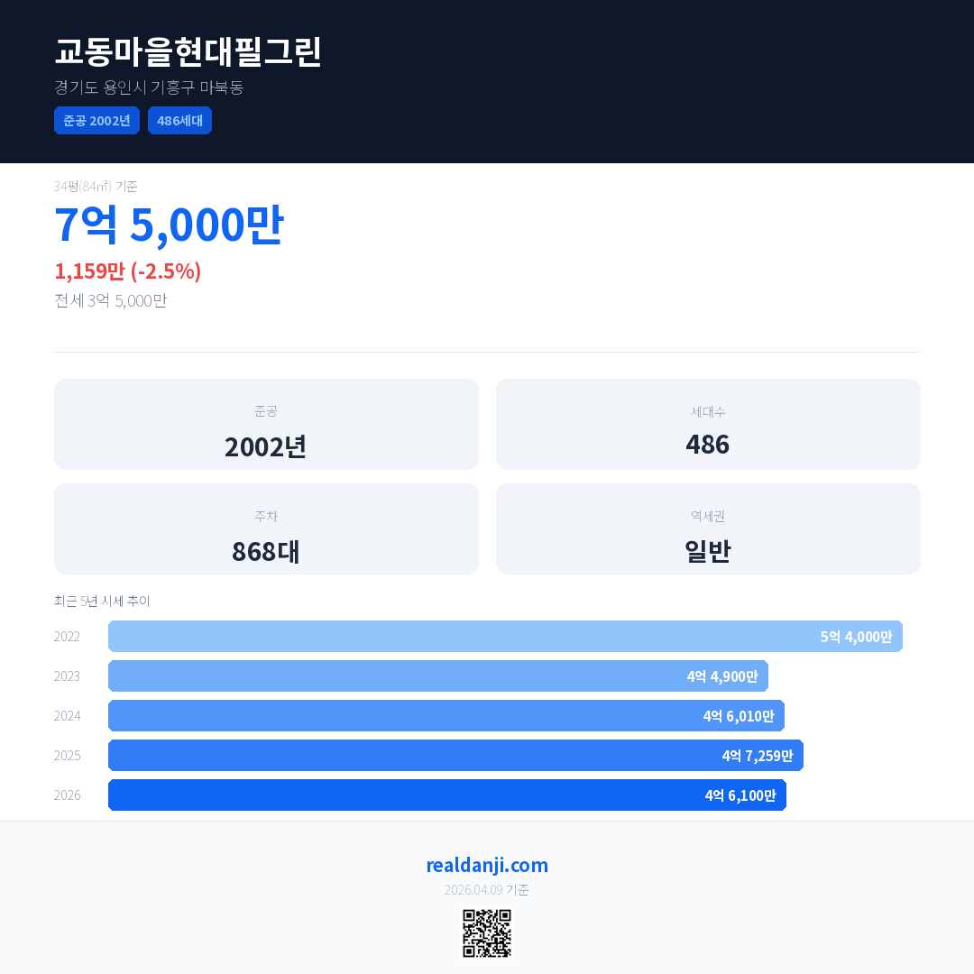 교동마을현대필그린 국민평형 기준 2026년 평균 거래가는 4억 6,100만으로, 전년 대비 2.5% 하락 했습니다.