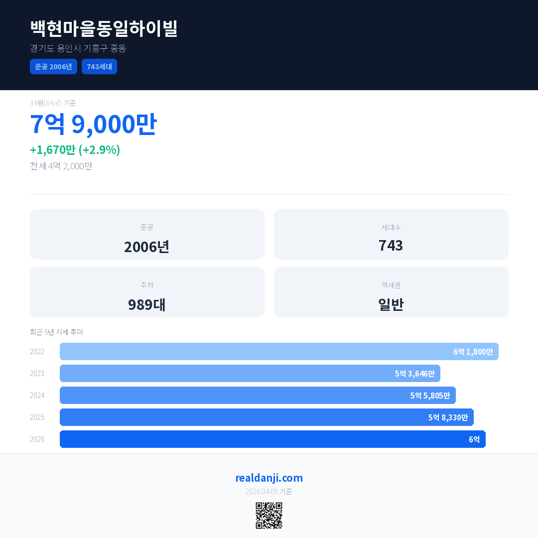 백현마을동일하이빌 국민평형 기준 2026년 평균 거래가는 6억으로, 전년 대비 2.9% 상승 했습니다.