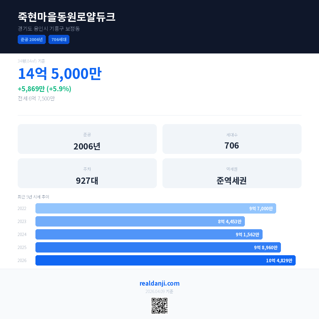 죽현마을동원로얄듀크은(는) 2006년에 준공되었으며, 현재 20년차입니다. 총 706세대 규모입니다.