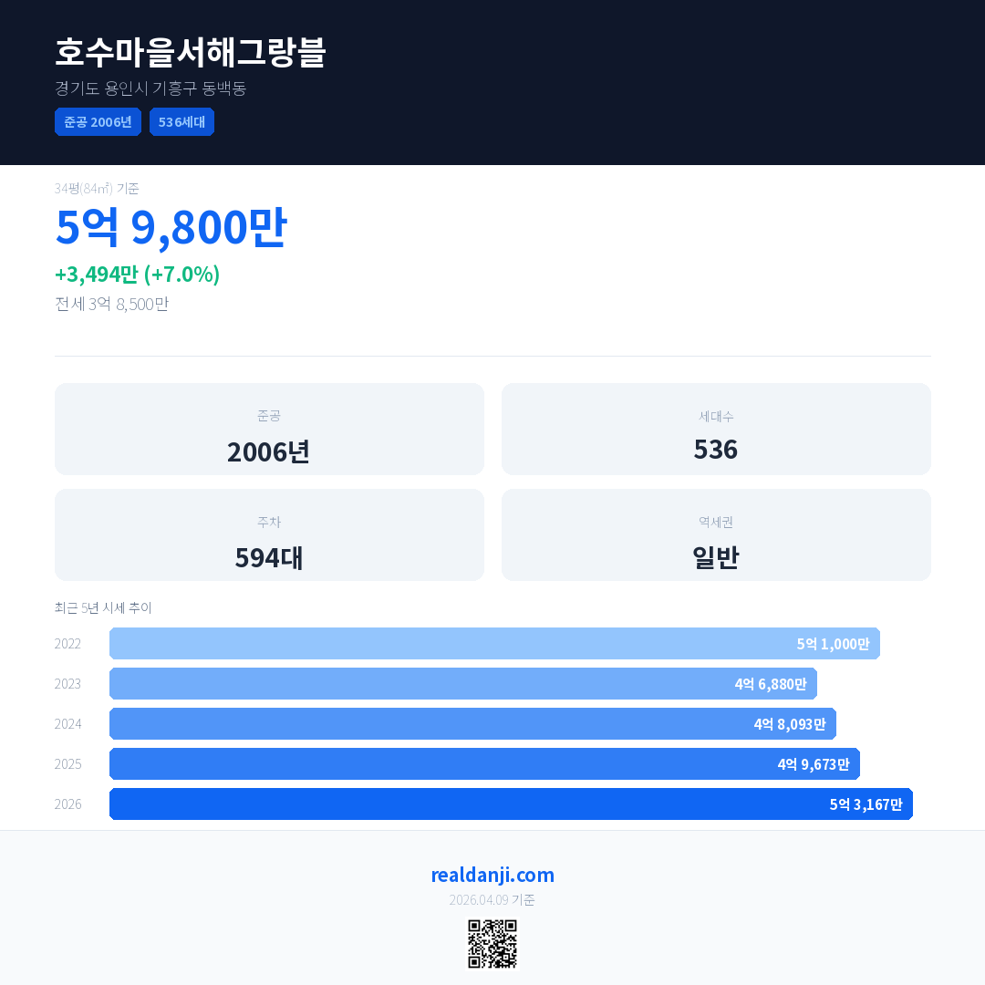 호수마을서해그랑블 국민평형 기준 2026년 평균 거래가는 5억 3,167만으로, 전년 대비 7.0% 상승 했습니다.