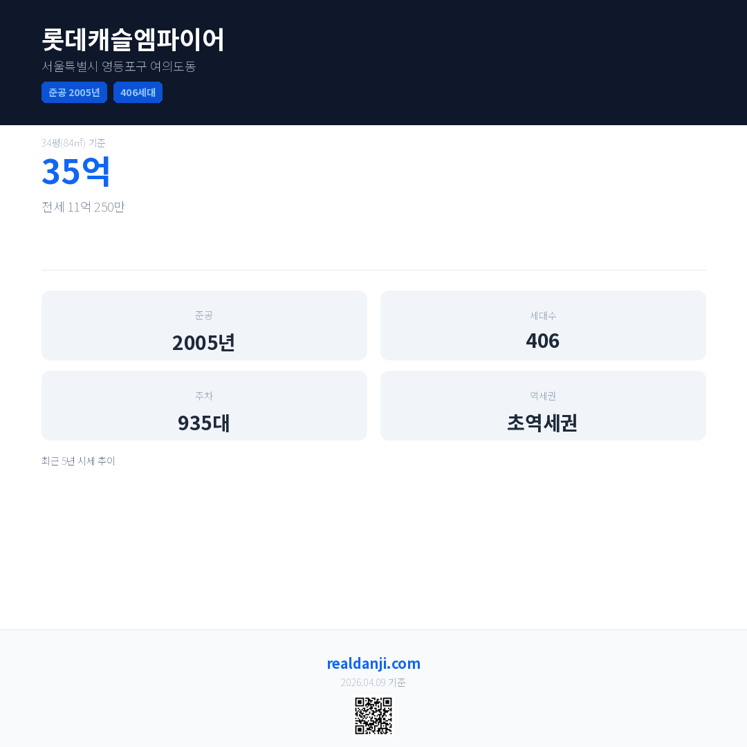 롯데캐슬엠파이어은(는) 2005년에 준공되었으며, 현재 21년차입니다. 총 406세대 규모입니다.