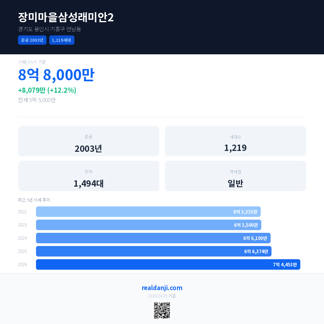 장미마을삼성래미안2 국민평형 기준 2026년 평균 거래가는 7억 4,453만으로, 전년 대비 12.2% 상승 했습니다.