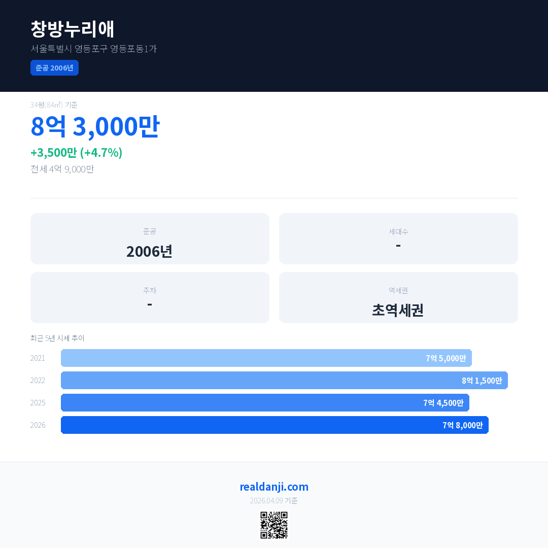 창방누리애 국민평형 기준 2026년 평균 거래가는 7억 8,000만으로, 전년 대비 4.7% 상승 했습니다.