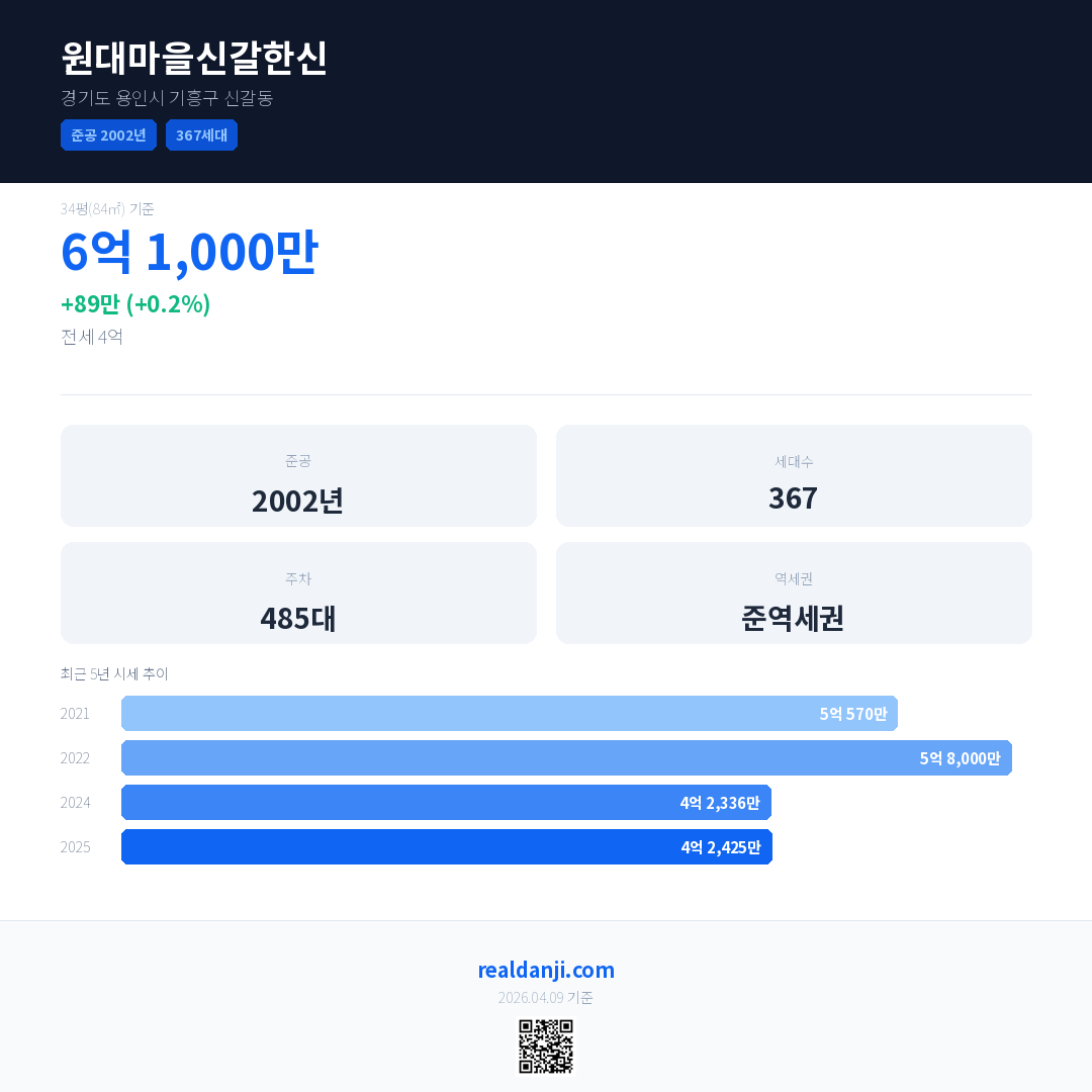 원대마을신갈한신 국민평형 기준 2025년 평균 거래가는 4억 2,425만으로, 전년 대비 0.2% 상승 했습니다.