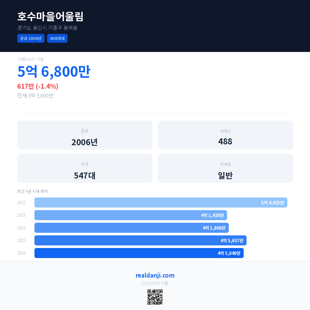 호수마을어울림은(는) 2006년에 준공되었으며, 현재 20년차입니다. 총 488세대 규모입니다.