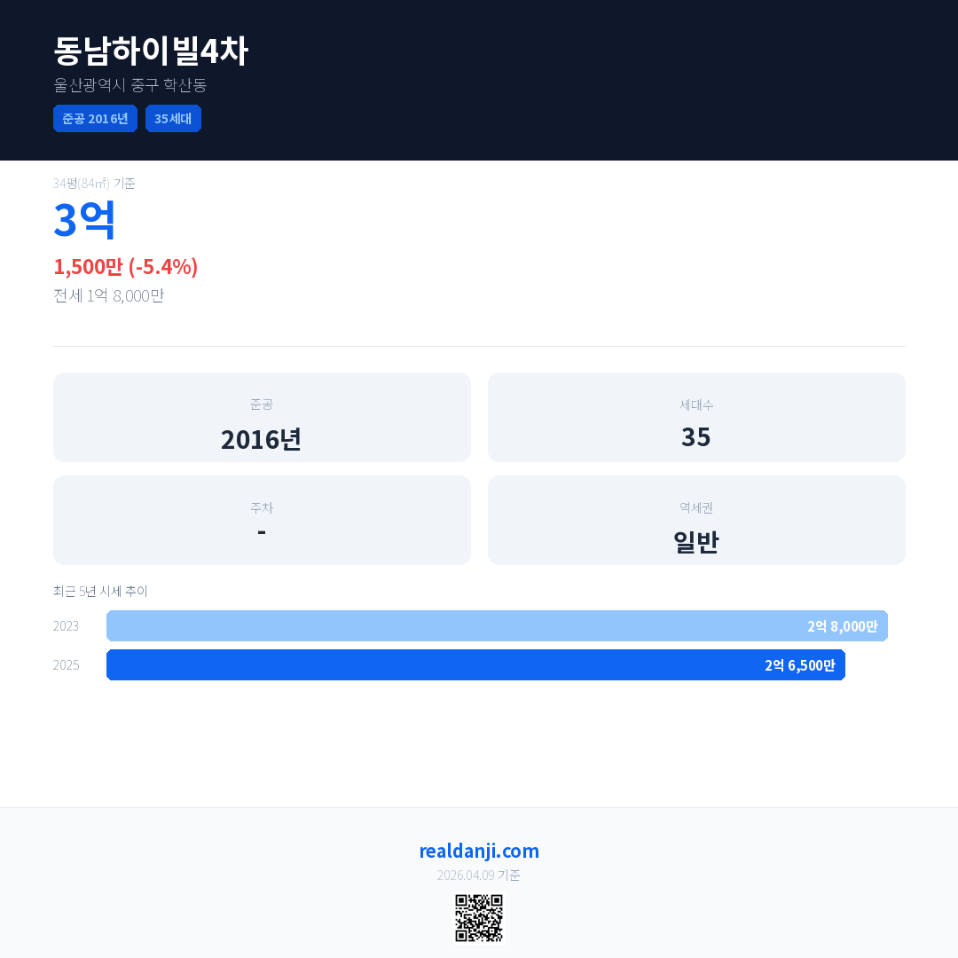 동남하이빌4차은(는) 2016년에 준공되었으며, 현재 10년차입니다. 총 35세대 규모입니다.