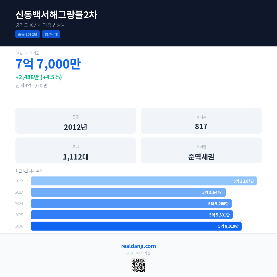 신동백서해그랑블2차 국민평형 기준 2026년 평균 거래가는 5억 8,019만으로, 전년 대비 4.5% 상승 했습니다.