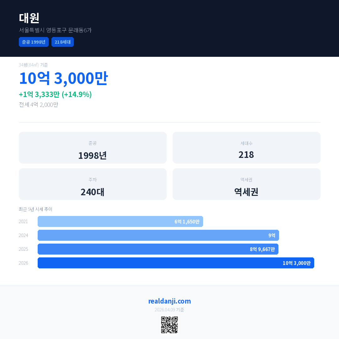 대원 국민평형 기준 2026년 평균 거래가는 10억 3,000만으로, 전년 대비 14.9% 상승 했습니다.