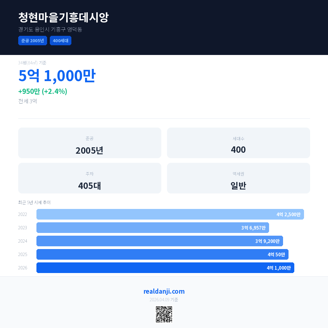 청현마을기흥데시앙 국민평형 기준 2026년 평균 거래가는 4억 1,000만으로, 전년 대비 2.4% 상승 했습니다.