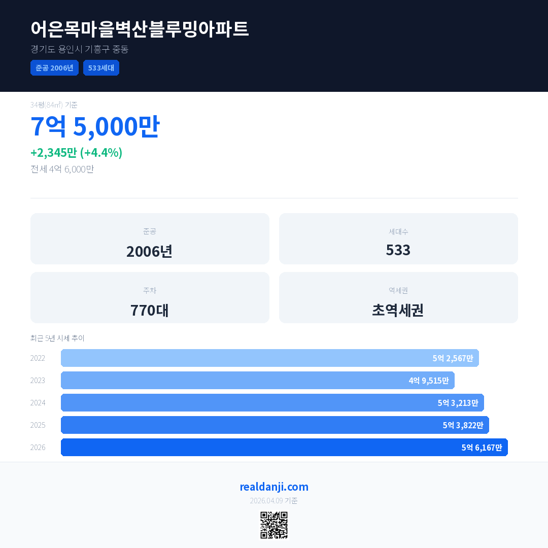 어은목마을벽산블루밍아파트 국민평형 기준 2026년 평균 거래가는 5억 6,167만으로, 전년 대비 4.4% 상승 했습니다.