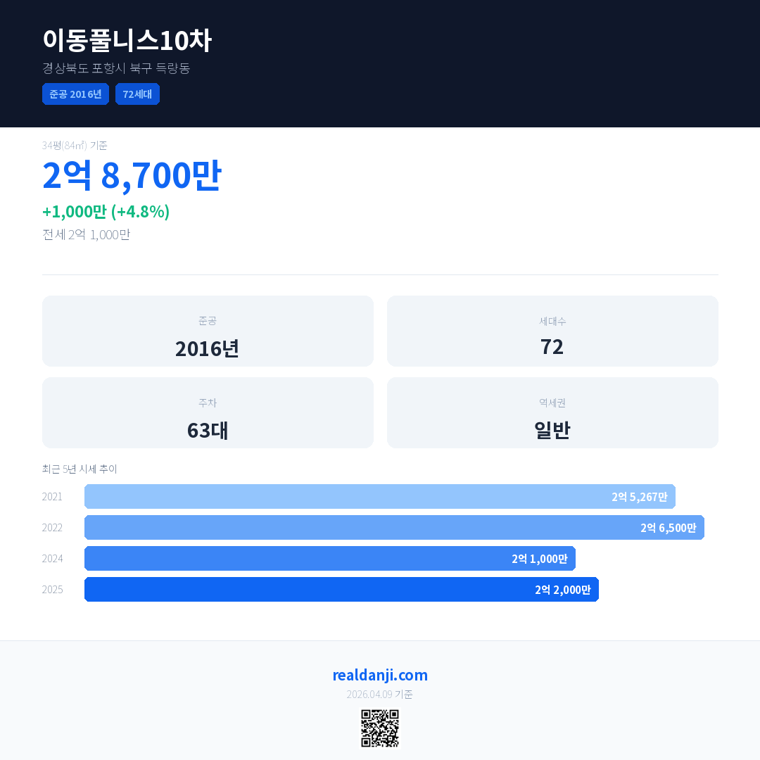 이동풀니스10차 국민평형 기준 2025년 평균 거래가는 2억 2,000만으로, 전년 대비 4.8% 상승 했습니다.
