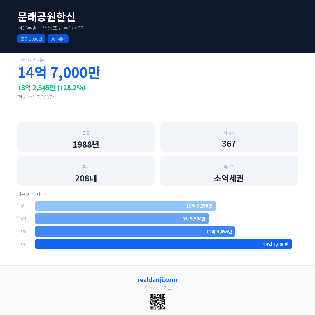 문래공원한신 국민평형 기준 2026년 평균 거래가는 14억 7,000만으로, 전년 대비 28.2% 상승 했습니다.