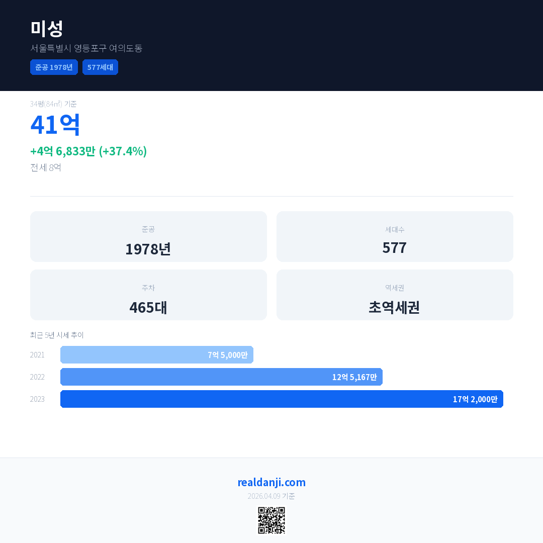 미성은(는) 1978년에 준공되었으며, 현재 48년차입니다. 총 577세대 규모입니다.
