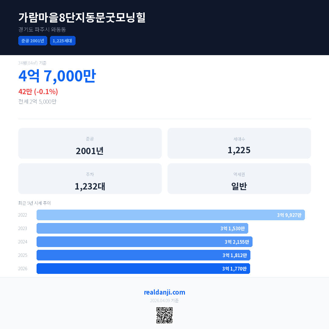 가람마을8단지동문굿모닝힐 최근 거래가는 3억 500만입니다. (2026-04)