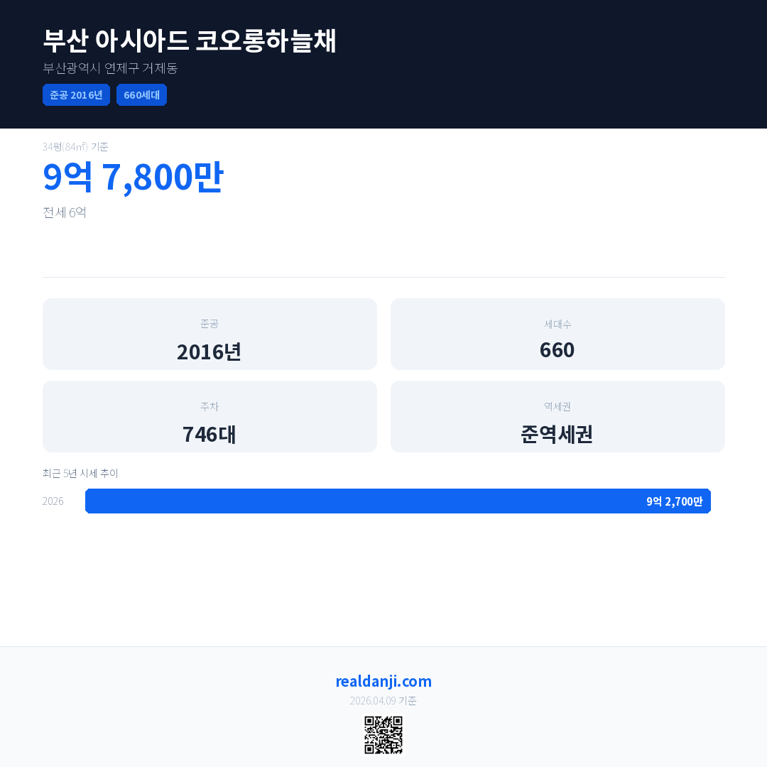 부산 아시아드 코오롱하늘채 국민평형 기준 2026년 평균 거래가는 9억 2,700만으로, 전년 대비 63.6% 상승 했습니다.
