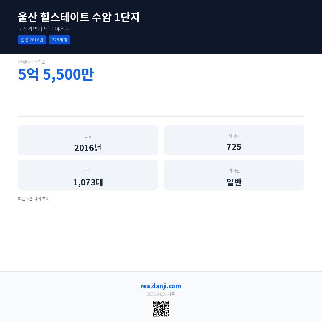울산 힐스테이트 수암 1단지 최근 거래가는 5억 5,500만입니다. (2020-01)