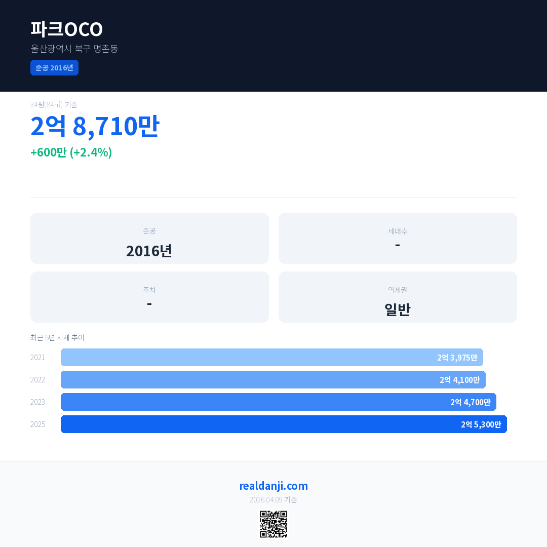 파크OCO 국민평형 기준 2025년 평균 거래가는 2억 5,300만으로, 전년 대비 2.4% 상승 했습니다.